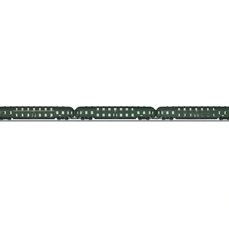 This is a Marklin 43597 HO Bi-Level 3 Car Passenger Set. 1 1st/2nd Class & 2 2nd Class Cars German Federal Railroad DB (Era III green). Model: The cars have finely detailed construction. They have separately applied grab irons. The cars have prototypical changes to the marker lights and window mountings. The cars are reproduced with scale length, and the minimum radius of 360 mm / 14-3/16 for operation requires a wide loading gauge. There are limits to the operation of these cars with this radius in the area of bridge railings, catenary masts, tunnel portals, etc. Accessory parts are included for complete detailing on the buffer beams for both car ends on each car. Printed train destination signs are included. Total length over the buffers 91.3 cm / 35-15/16. DC wheel set per car 4 x 700580. Highlights: Prototype bi-level cars to go with the class V 160 Lollo diesel locomotive, item number 37741.