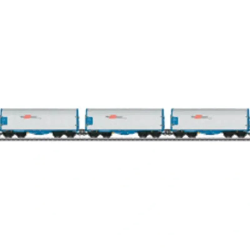This is a Marklin 47216 HO RCA Sliding Tarp 3-CarSet. Features: All of the cars have closed tarps. They also have end walls rounded at the top and a side hand wheel. The cars have type Y 25 welded trucks. All of the cars have different car numbers and are each individually packaged. There is also a master package. Length over the buffers for each car 13.8 cm / 5-7/16. DC wheel set per car 4 x 700580.