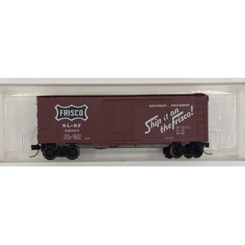 This is a Micro-Trains 21080 N Scale Frisco 40′ Standard Steel Plug Door Boxcar #52065. It features plastic construction, plastic wheels and axles & has knuckle couplers.