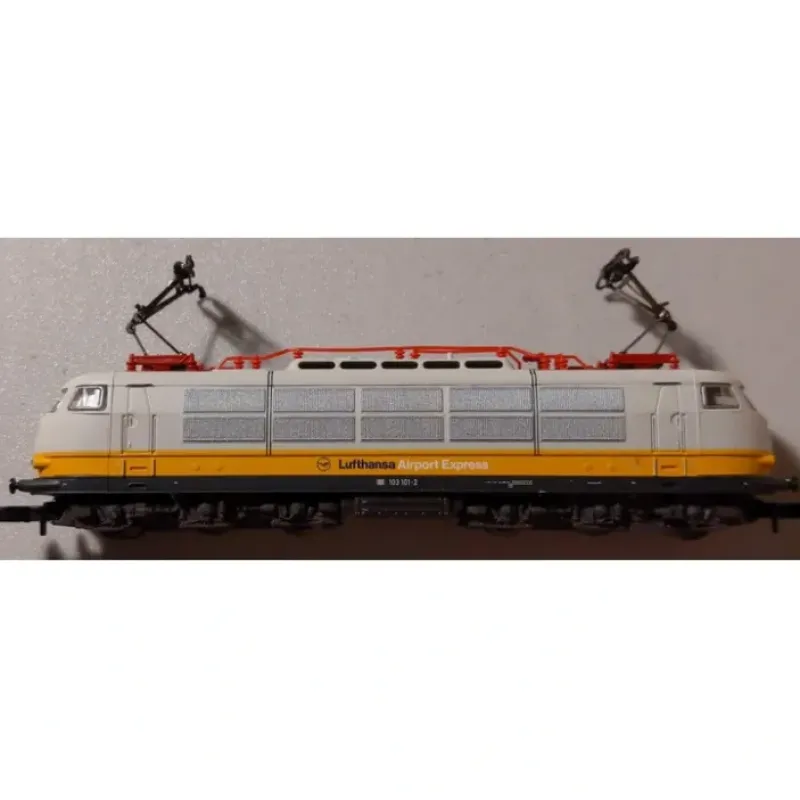 Here is a Marklin Z Scale Lufthansa Airport Express Electric Locomotive. This locomotive features a metal and plastic construction with a weighted chassis, a powerful motor, directional lighting, metal wheels and axles, fish-hook couplers, and attractive decoration.