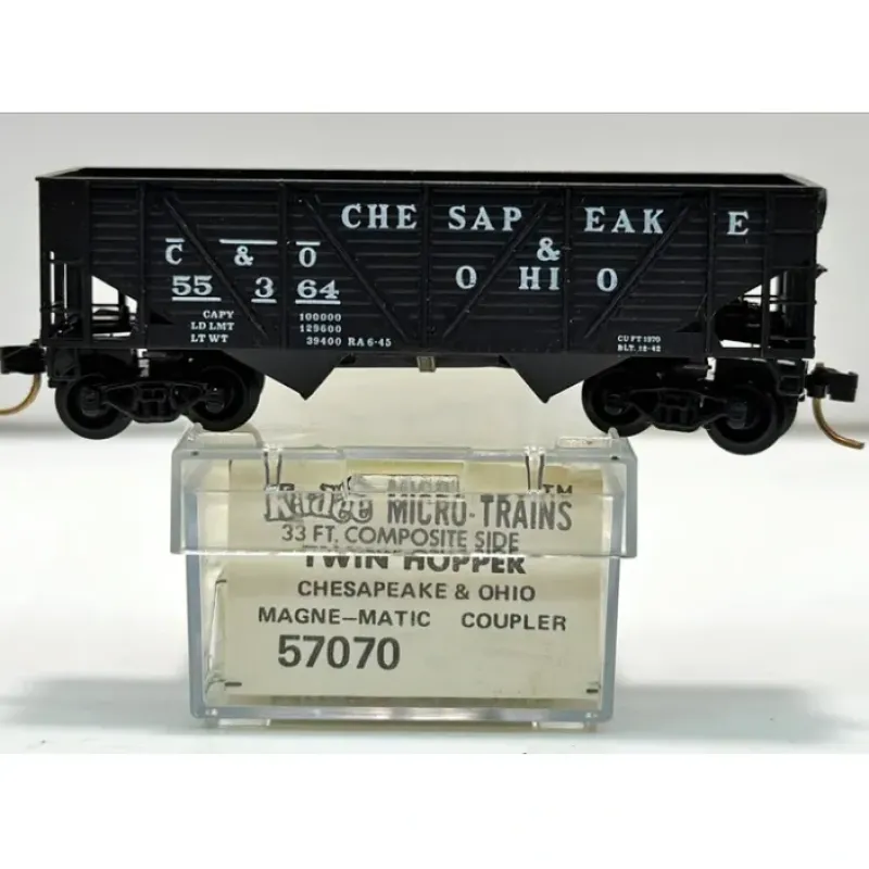 Here we have a Micro-Trains 05700070 N C&O 33′ Twin Bay Composite Side Hopper #55364. It features plastic construction, plastic wheels and axles & has knuckle couplers.