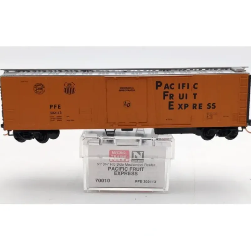 Here is a MicroTrains 70010 N Scale Pacific Fruit Express Reefer Car. Features include plastic construction, plastic trucks, plastic couplers, and plastic wheels.
