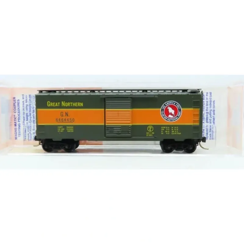 This is a Micro-Trains 6464-450 N Great Northern Box Car #6464450. This car features plastic construction, plastic trucks, plastic wheels and axles, and knuckle couplers.