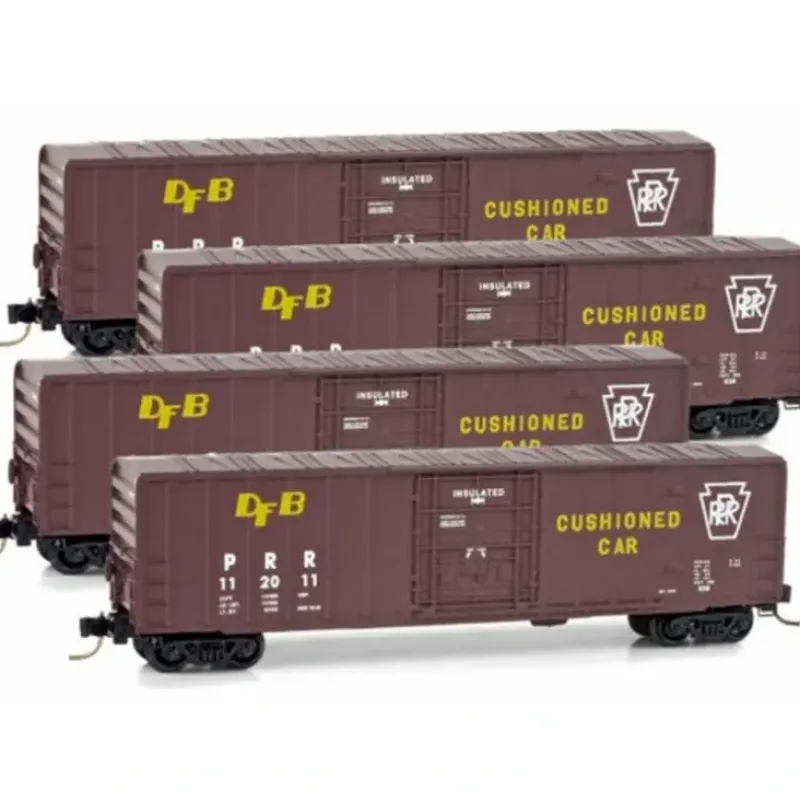 This is a Micro-Trains 99300093 N Scale Pennsylvania Railroad 50′ Rib-Side Plug-Door Boxcar No Roofwalk 4-Car Runner Pack – Ready to Run #112011, 112018, 112025, 112027. These cars feature plastic construction, plastic trucks, plastic wheels and axles, and knuckle couplers.