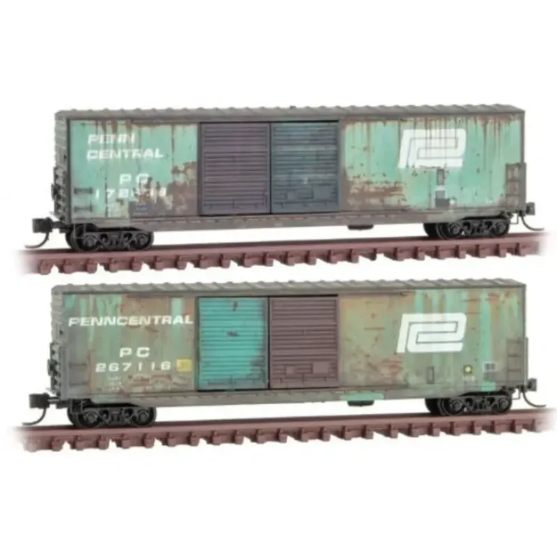 Here is a Micro-Trains 99305840 N Scale Penn Central Weathered Boxcar (Set of 2). This item features a plastic construction, plastic wheels, and knuckle couplers.