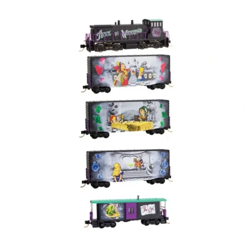 This a MicroTrains 99321250 N Alice in Wonderland Train-Only Set. This colorful train set features Alice and five main characters in the classic story, Alice in Wonderland. Join Alice and the March Hare, Mad Hatter, the Queen of Hearts, the Caterpillar and if you look closely, the Cheshire Cat on the only train departing to the magical land of Wonderland. This curious train is pulled by an SW1500 and has three modified box cars and bay window caboose.