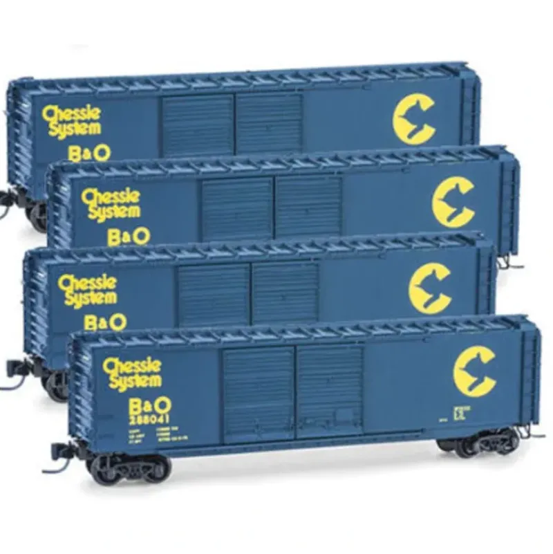This is a Micro Trains Line 99400074 Z Scale 50′ Double-Door Boxcar 4-Car Runner Pack – Ready to Run Chessie System/B&O #288020, 288156, 288188, 276224 (blue, yellow)