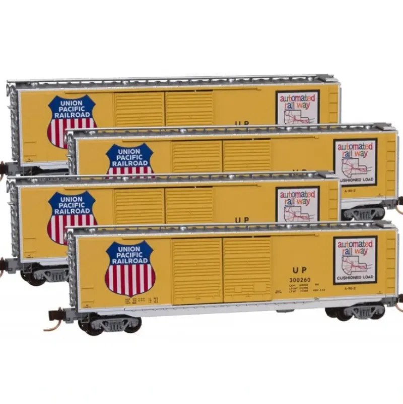 This is a MicroTrains 99400080 Z Union Pacific 50′ Double-Door Boxcar 4-Car Runner Pack – Ready to Run