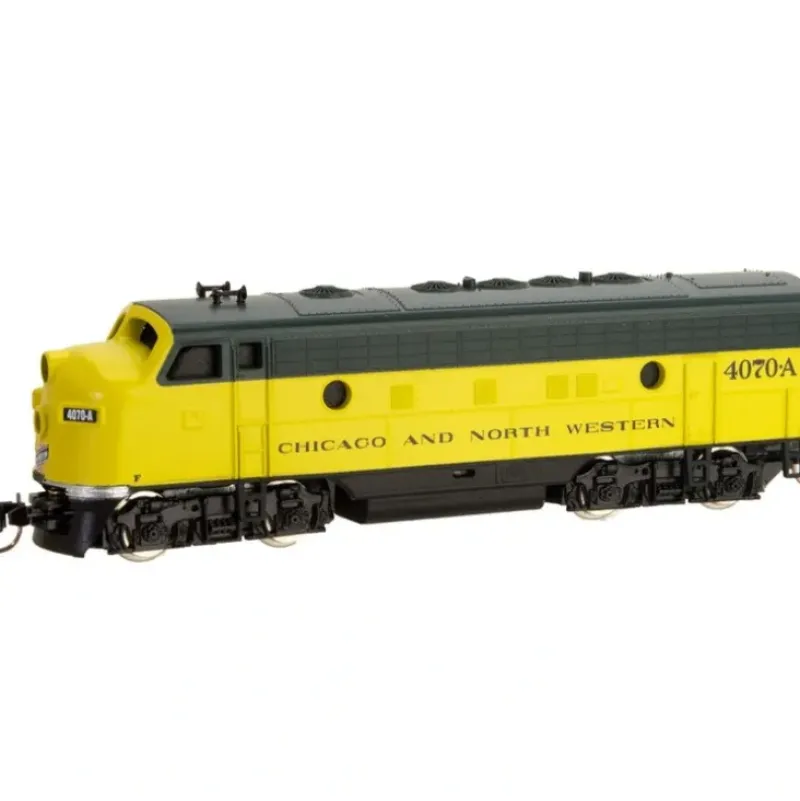 This is a MicroTrains 98001381 Z Chicago & North Western EMD F7A – Standard DC #4070-A. CNW began painting F-units in the simplified yellow/green with Chicago and North Western spelled out on the flanks and nose shields by 1961. The engines retained their four digit 4000 series numbers until 1971-72 when the remaining F-units that hadnt been traded in on newer units were numbered into the 200 series for A units and the 300 series for B units with CNW heralds on the nose and sides in simplified yellow/green. Units painted in the original black/yellow/green scheme could be found still in the late 60s.