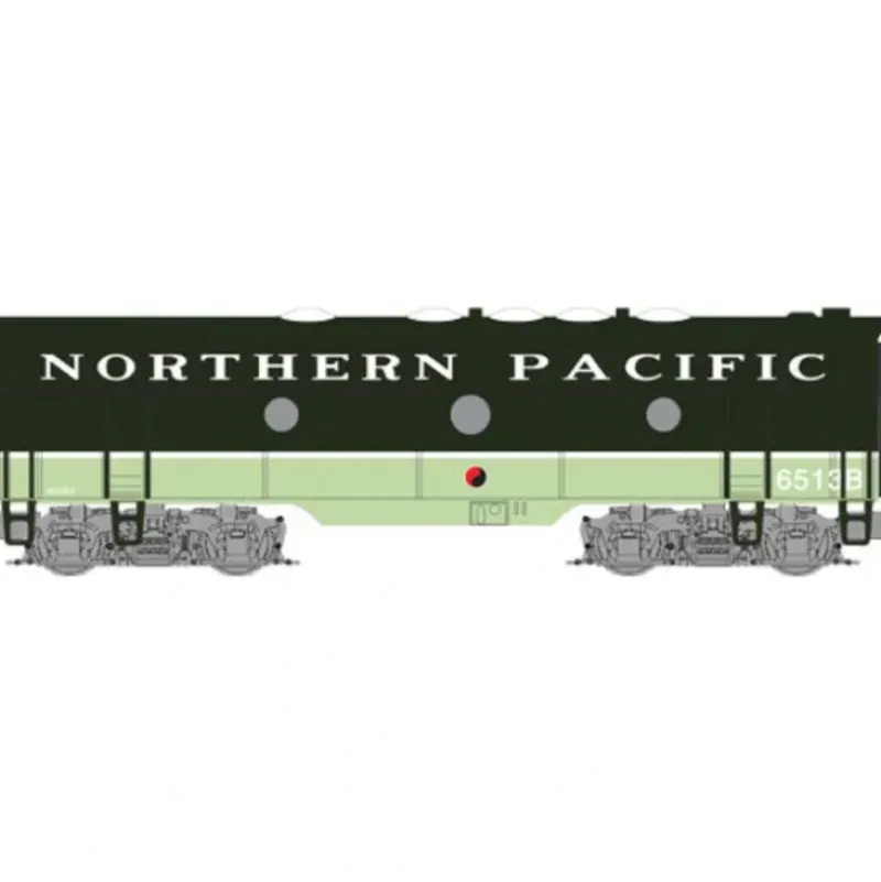 This is a Micro Trains Line 98002351 Z Scale EMD F7B – Standard DC Northern Pacific #6511B (Loewy 2-Tone Green, Main Street Slogan) The EMD F7 was a 1,500 horsepower (1,100 kW) diesel-electric locomotive produced between February 1949 and December 1953 by the Electro-Motive Division of General Motors (EMD) and General Motors Diesel (GMD). A total of 2,366 cab-equipped lead A-units and 1,483 cabless booster or B-units were built.