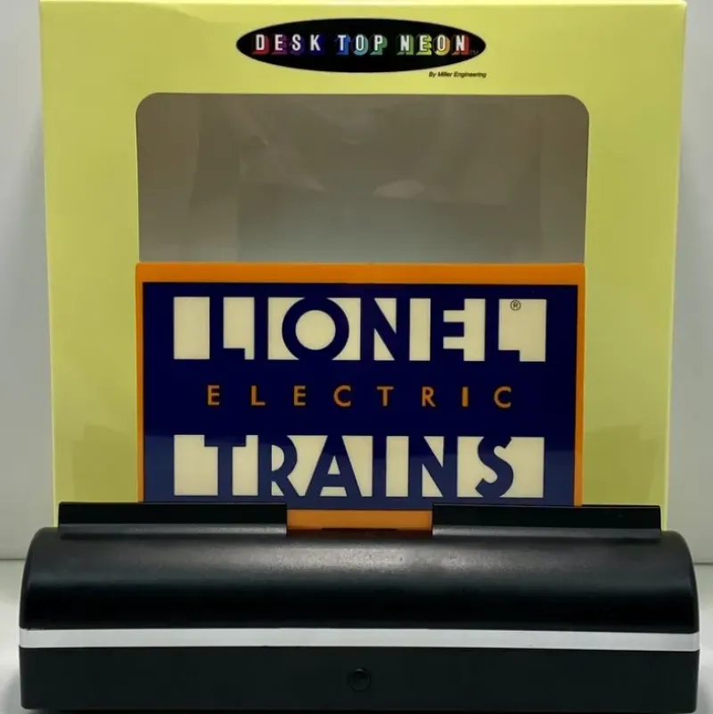 This is a Miller Engineering 2150 O Scale Lionel Desk Top Neon Animated Billboard. This is a Miller Engineering’s Engineering’s line of simulated animated meon signs uses state of the art space age materials to create a soft neon like glow. Each unit comes with 6 pre-programmed chase patterns that will create an extraordinary viaual effect. The sign runs on 3 AA battries (not included) or optiona AC adapter.