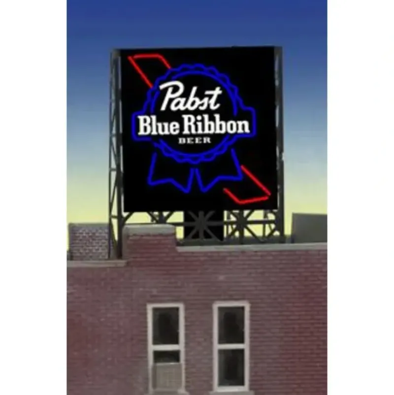 This is a Micro Structures 338825 N/Z Pabst Beer Animated Rooftop Billboard Small for N & Z Scales Lattice. This is a new N or Z scale roof top billboard sign for PABST BLUE RIBBON BEER by Miller Engineering. The sign is actually the HO/O scale window sign and designed with a set of photo etched supports so it can be used as roof top billboard for N & Z scales. The frame size is 1 wide X 1.35 Tall. These signs have all the features of all Miller Engineering billboards. They run on 4.5 volts DC like our other billboards and are compatible with the AC adapter and #4804 converter module. Support Size: 1 x 1-3/8 2.5 x 3.4cm