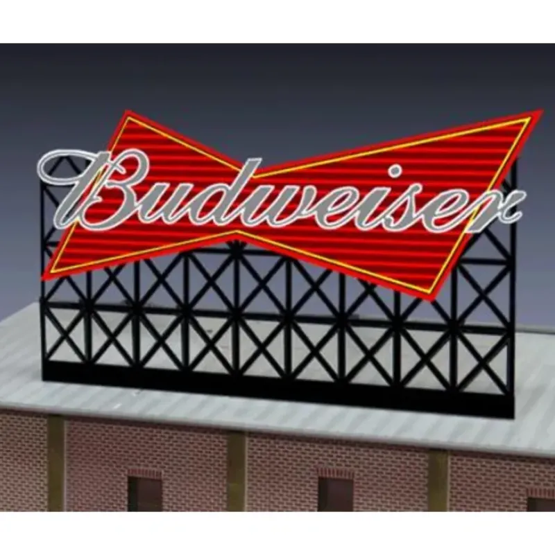 This is a Miller Engineering 4982 N Scale Budweiser Beer Animated Neon Billboard 3-3/4 x 2 9.5 x 5.1cm. Miller Engineering’s second beer sign. Started in 1860 when a local brewery was taken over in St. Louis, Missouri. Today this brewing company is one of the largest producers of beer in the world. It gained success in its first years by being the first beer company to use pasteurization to keep the freshness of the beer, the first company use refrigerated railroad cars to keep beer cold during transport. It Features: – One EL Sign Lamp – Multi Channel Sequencing Sign – One Ready to Run Power Supply – Runs on 3 AAA Batteries (NOT Included) – Complete Instructions – Suitable for N Scale – Dimensions (Width x Height) 3.75 x 2