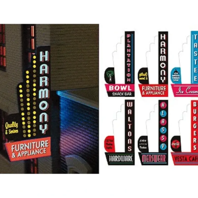 This is a Miller Engineering 67811 All Scales Animated Multi-Graphic Vertical Neon Sign Kit with 6 Overlays Downtown Series #2 – Left – Large. These lighted signs add realism to any storefront. Each includes colorful graphic overlays for six businesses that provide full-color lighted lettering; plug-and-play electronics, on-off switch and battery holder that uses three AAA batteries (sold separately). Larger signs are suitable for HO and larger scales; smaller signs can be used in HO and N Scales. All are available in left- or right-handed orientations and are easily mounted to the front of your storefronts. Suitable for steam or diesel eras. Sign features animated rays.