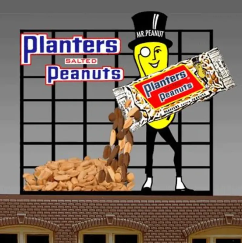 This is a Miller Engineering 7061 HO/O Scales Animated Neon Billboard Planters Peanuts with Mr. Peanut Large 4 x 4-1/2 10.2 x 11.4cm. An Italian immigrant named Amedeo Obici, founder of Planters, was born in 1876 in the small town of Oderzo, near Venice, Italy. He came to America, first to Brooklyn then to Wilkes-Barre, Pennsylvania. He opened his own fruit stand and invested in a peanut roaster. Here he linked his life’s fortune with the peanut. Two years later, the firm was incorporated as Planters Nut and Chocolate Company. Planter’s mascot, Mr. Peanut, is such a nut! Everybody’s just crazy about him! Since his introduction in 1916, to help advertise the sales of the country’s first roasted peanut company, Mr. Peanut has become one of the nation’s best-known advertising characters. Based on the original drawing of a 13-year-old boy, the ever-dapper Mr. Peanut eventually added a top hat, white spats, ebony cane, and monocle to his unique ensemble. Great addition to your layout or a diorama. Dimensions: approx. 4.5 high x 4 wide Kit includes: Electroluminescence sign Power supply (requires 3 AAA batteries – not included) 6 popular theatre name peel & stick overlays Complete instructions Runs on 3 AAA batteries or 4.5v DC wall adapter power supply (sold separately).