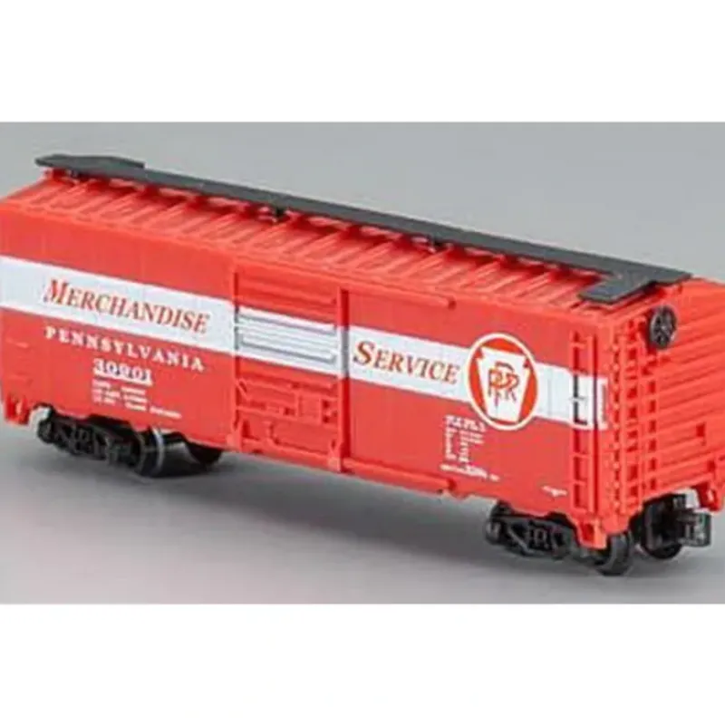 N Scale 40′ Box Car with Sliding Door, Pennsylvania Merchandise Service. Features include: plastic construction, metal wheels, kadee couplers, and accurate printing and lettering.