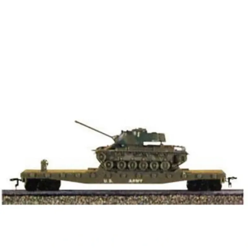 This is an HO Scale Army 40′ Flatcar with Tank from Model Power. Features: Compatible with any HO scale railroad equipment, Olive green plastic flatcar has US Army in White on each side, The flatcar carries a very detailed Olive Green plastic tank with a rotating turret, Realistically molded panel lines and rivet detailing, Separately applied black plastic brakewheel, Black plastic dual axle trucks with black plastic wheels, Truck-mounted couplers, Packaged in a plastic tray within a windowed box. Scale: HO 1:87. Length: 6-3/4 (17mm). Width: 1-1/4 (32mm). Height: 2-1/8 (54mm).