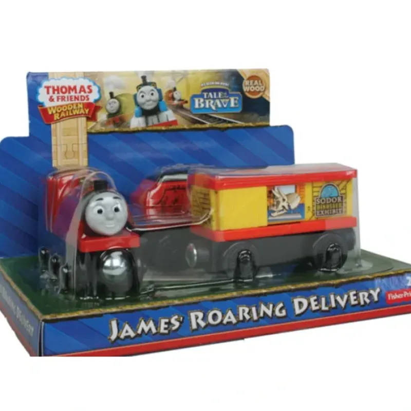 This is a Fisher Price BDG22 Thomas & Friends Wooden Railway James’ Roaring Delivery . Inspired by the Tale of the Brave movie, James is pulling a cargo car filled with crates for the dinosaur exhibit. Hear the roar of a dinosaur when the cargo door is opened and closed! Includes: James and A cargo car.