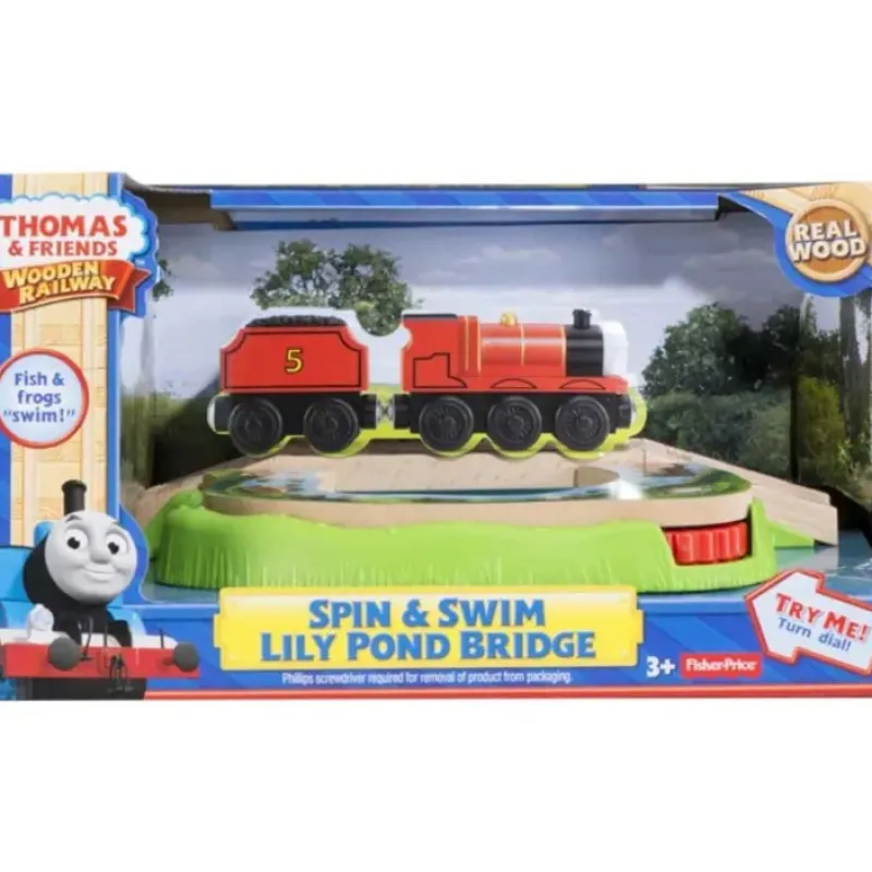 This is a Fisher Price BDG56 Thomas & Friends Wooden Railway Spin & Swim Lily Pond Bridge. This fun play piece adds the excitement of a bridge and a pond to the track! It connects to any Thomas & Friends Wooden Railway train set, and the fish and frogs swim in the pond with just a spin!
