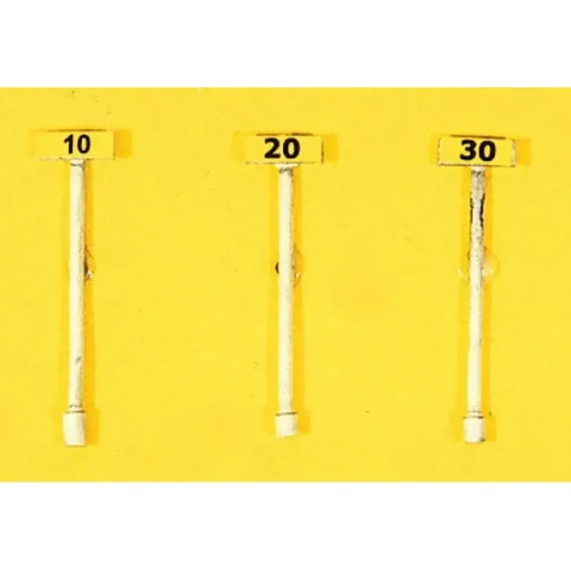 This is a JL Innovative Design 361-841 HO Scale Custom Railroad Right-of-Way Signs Slow Speed Signs 10 20 & 30MPH – Rectanglar Style pkg(3)