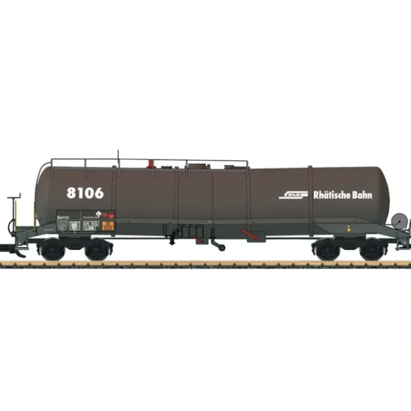 This is LGB 49700 G Scale RhB Tank Car (Set of 3). This set includes #8102, 8106, 8108. The 8106 car is factory weathered. Each car features plastic trucks, operating latch couplers, metal wheels and axles.
