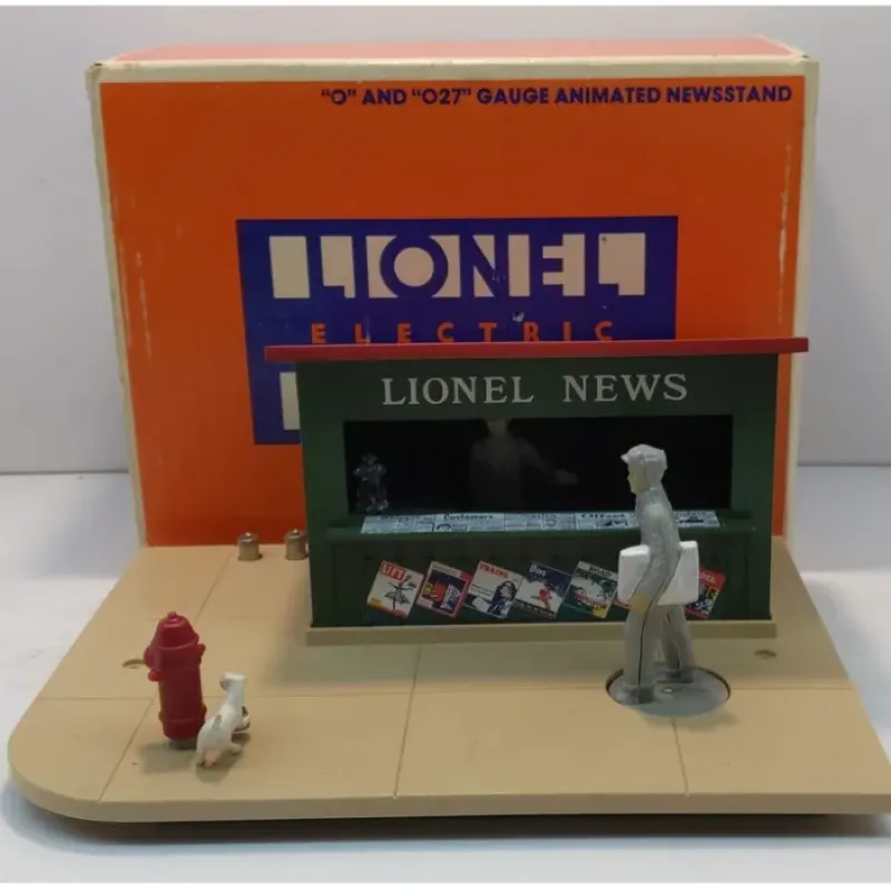 This is a Lionel 6-2308 O Gauge Animated News Stand from 1982-83. It features a turning paperboy and his newspaper, a dog circling the fire hydrant, and the newsman moving about the stand. It is a reissue of the Postwar Era 128 Newsstand.