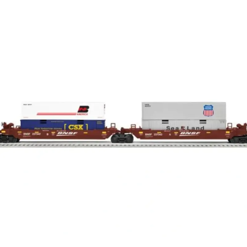 Here is a Lionel 6-81466 Burlington Northern Santa Fe Maxi-Stack (Set of 2). Features include plastic construction, die-cast trucks, knuckle couplers, metal wheels & axles and two removable molded containers per car.