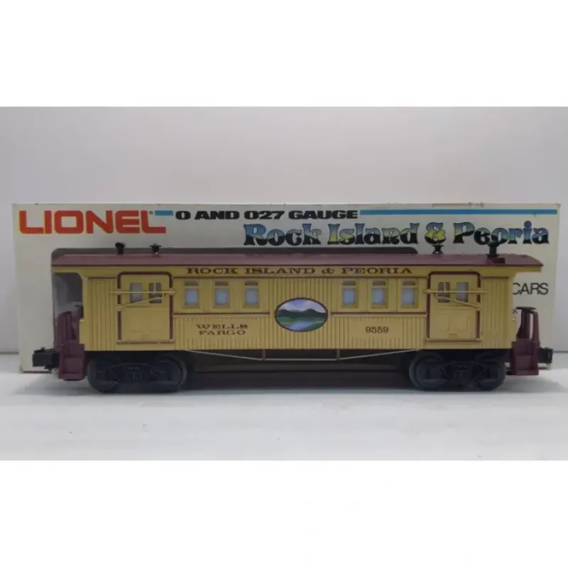 This is a Lionel 6-9559 O Gauge Rock Island & Peoria Combine Car from 1981-82. It features a durable ABS body, an illuminated interior, plastic trucks with operating knuckle couplers and it measures 11 inches long.