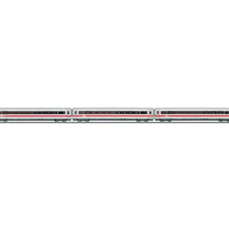 This is a Marklin, Inc 43705 HO Scale ICE 1 Intermediate Passenger 3-Car Add-On Set- 3-Rail – Ready to Run German Railroad DB AG (Era VI 2012, white, black, red, gray). Model: The 3 intermediate cars are an add-on to the 37703 train. The cars have special close couplings with guide mechanisms. The interior lighting is powered by means of continuous electrical connection in the entire train. Total length approximately 79.2 cm / 31-3/16.