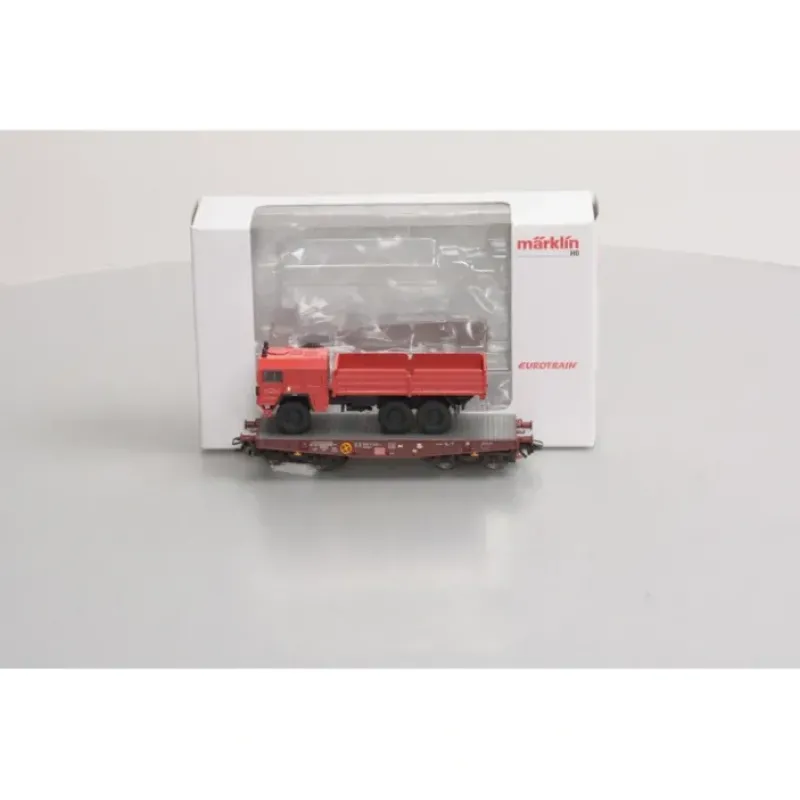 DB-AG Heavy flat car with Firebrigade Vehicle load. Prototype: 2 German Railroad, Inc. (DB AG) type Rlmmps 651 heavy duty flat car. Model: The frame for the heavy duty flat car is constructed of metal. Other subassemblies are made of detailed plastic parts. Loaded with one fire-fighting vehicle,The Fire-brigade truck has separately apploied details. DC wheel set 8 x 700580. One-time series.