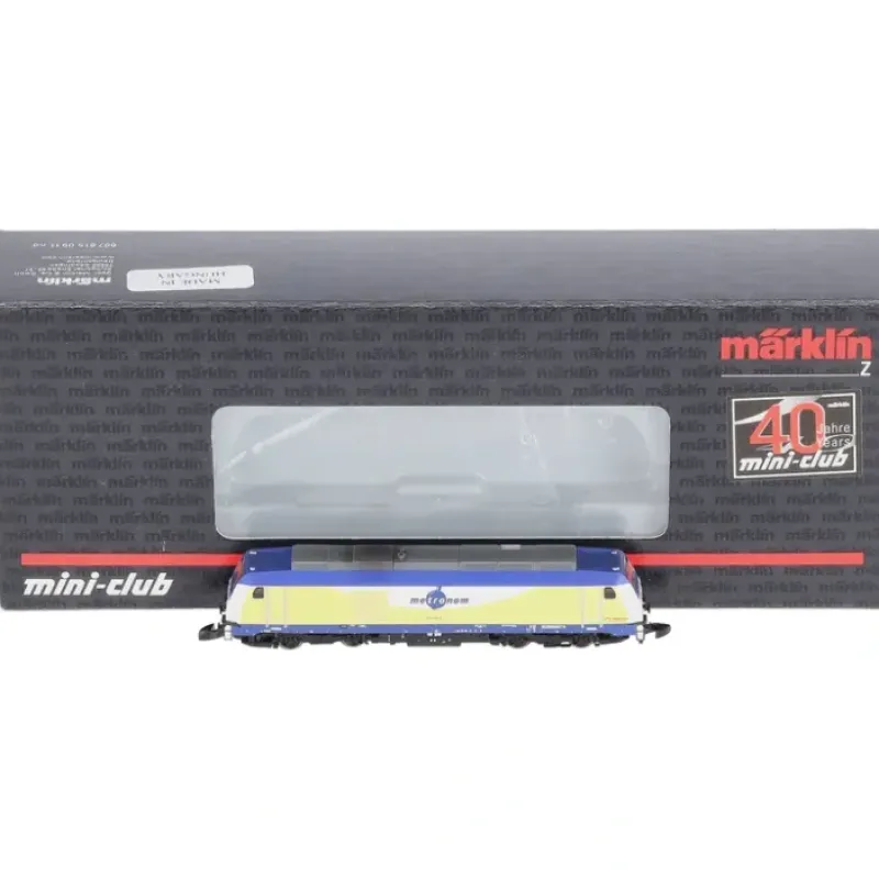 This is a Marklin, Inc 88370 Z Scale Bombardier Traxx Class 246 Diesel – Standard DC Metronom Railroad Uelzen (Era V, yellow, blue, white). Prototype: Class 246 diesel locomotive TRAXX diesel. In 2006, the firm Bombardier presented the class 246 at the Innotrans show. This class is a diesel electric locomotive derived and developed directly from the electric locomotives in the TRAXX family. This locomotive has a maximum speed of 160 km/h / 100 mph, weighs 82 metric tons, has a nominal performance of 2,200 kilowatts / 2,991 horsepower, and is planned for passenger service. The state of Lower Saxony ordered 11 units that have again been leased to the metronom Railroad Company. These locomotives have the attractive blue and yellow paint scheme of the metronom trains und together with the modern bi-level cars they stand for modern, punctual, reliable service on regular schedules. Model: The locomotive has a 5-pole motor. Both trucks are powered. The headlights are maintenance-free warm white LEDs. Length over the buffers approximately 87 mm / 3-7/16. Highlights: New tooling. Correct paint scheme and lettering. Maintenance-free LEDs for headlights. 5-pole motor.