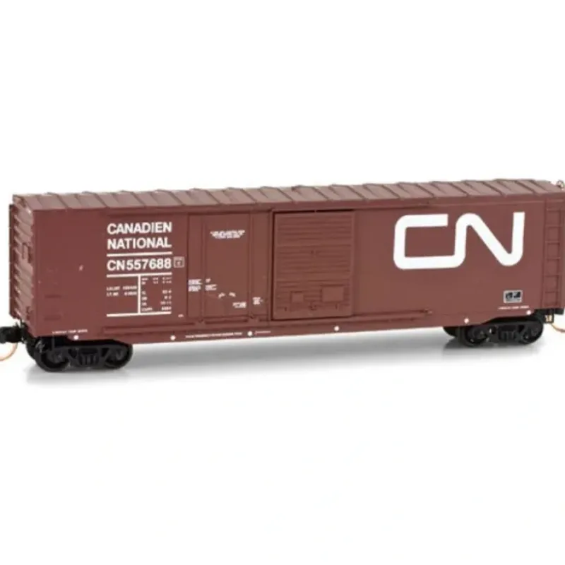 This is MicroTrains 7600010 50′ Std Box CN #557688. 50′ plug & sliding door boxcar no roofwalk, ready to run. Canadian National #557688 (boxcar red, large noodle logo). 50′ standard boxcar with plug and sliding doors and no roofwalk is painted box car red with white wet noodle CN logo and white lettering in both English and French. It was built in December 1972 and runs on Barber roller bearing trucks. The Canadian National Railway Company is a Canadian Class I railway headquartered in Montreal, Quebec, that serves Canada and the Midwestern/Southern United States. CN’s slogan is North America’s Railroad.