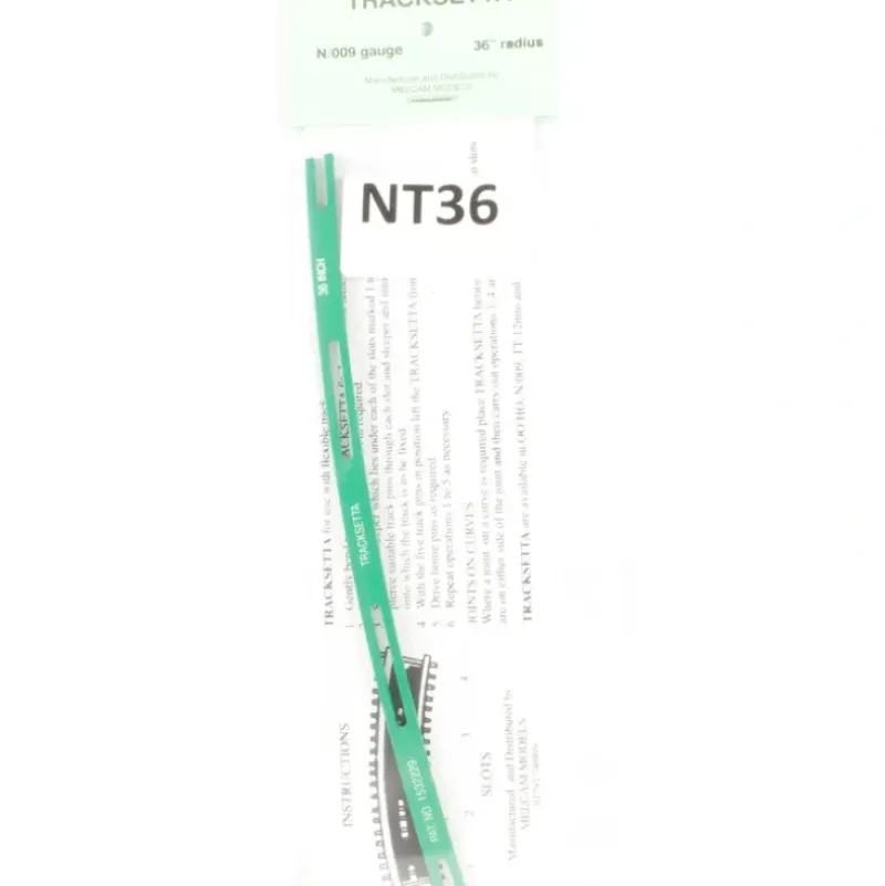 This is a Peco NT-36 N Tracksetta Track Laying Template — 36 91.5cm Radius Curve. Coated steel template makes it easy to lay track with smooth curves and straight lines without dog-legs. Simply fit between the rails to hold the track in position and pin track down through the slots. With Tracksetta, reverse and transition curves can be laid easily and accurately even when working alone. An invaluable aid.