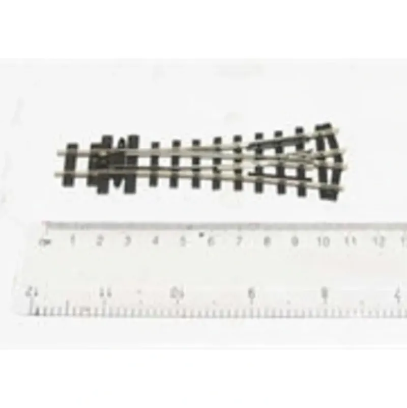 This is a Peco SL-E497 HOn30 Y Turnout, Rough Sleepers. Small radius OO9 / HOe turnout with rough ‘crazy track’ style sleeper base and live ‘electrofrog’ crossing for good electrical contact when running small locomotives. 457mm/18in radius Y turnout for OO9 narrow gauge model railways. Length 109mm 4 5/16in. Angle 22.5 degrees between diverging tracks, Code 80 rail. Use Peco N gauge SL-310 (metal) & SL-311 (insulated) rail joiners. A useful Y point which matches N gauge medium radius points but produced primarily for OO9 narrow gauge modelers. The point can be used for N gauge, but the larger flange ways spacing (compared to Pecos’ new N gauge Streamline points) may need some disguising.