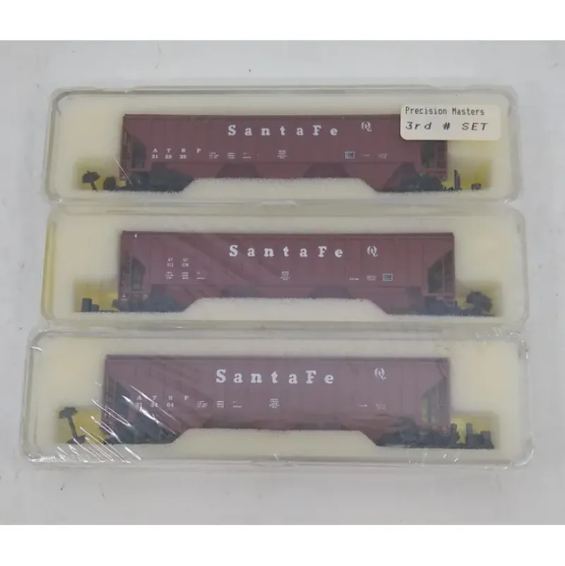 Here we have a Precision Masters 1402 N Scale Santa Fe 3-Bay Covered Hoppers (Set of 3). It features plastic construction, plastic wheels and axles & has rapido couplers.