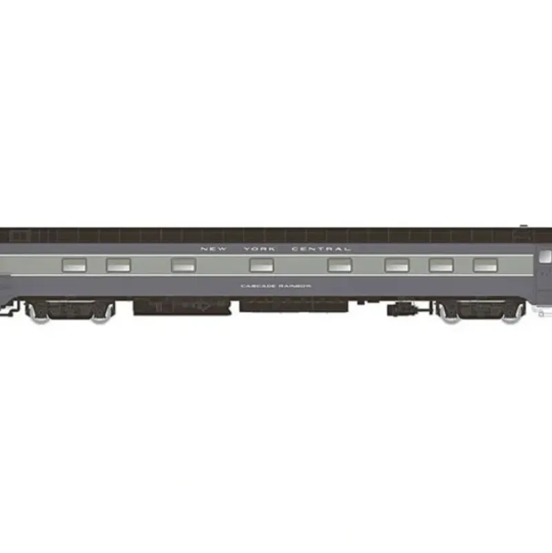 This is a Rapido Trains 504051 N Scale New York Central Panorama Line(TM) Pullman-Standard Plan #4186 10-5 Sleeper, Partial Skirting #10081 Cascade Green (Post-1948 Scheme, 2-Tone Gray). This highly detailed car features an injection-molded body, full interior, underbody detailing, metal wheels, body-mounted Micro-Trains(R) knuckle couplers, installed Easy-Peasy battery-powered interior lighting, diaphragms with etched-brass end gates and more.