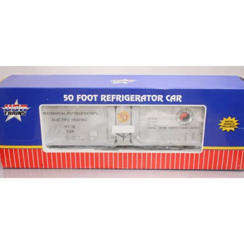 This is a USA Trains 16703 G Northern Pacific 50′ Mechanical Refrigerator Car #139. Features include a sliding grated door, opening plug door, full underbody detail, fuel tanks with gauges and metal wheels.