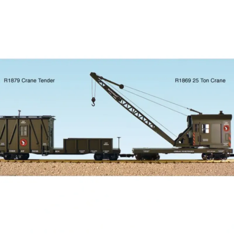 This is a USA Trains 1869 G Great Northern 25-Ton Crane. This features Rotating Cab, Boom Can Be Raised or Lowered, Hook Can Be Raised or Lowered, Metal Wheels, Quality Graphics, Matching Crane Tender Available, Crane Instructions.