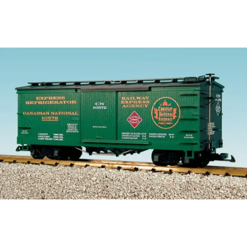 This is a USA Trains 19082 G Canadian National/Railway Express Agency Wood Box Car #10572. This features Woodgrain Detailed One Piece Body, Operating Doors, Separately Molded Handrails, Ladders, Corner Steps and Brake Platform, Both Hook/Loop and Knuckle Couplers Provided, Brass Brake Rod, Detailed Archbar Trucks, Quality Graphics, Authentic Paint Schemes, and Approximate Length 14 -3/8.