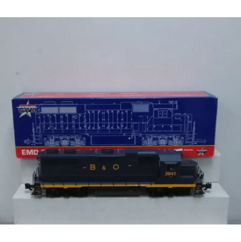 This is a USA Trains 22220 G Baltimore & Ohio GP38-2 Powered Diesel Locomotive #3841. Models feature two motors, PowerTrac drive system, operating smoke stacks, detailed cab interior, metal handrails, operating directional headlight, rotating roof fans and quality graphics. Length: 22-1/2.