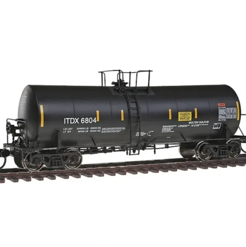 This is a Walthers 920-100005 HO scale 40′ Trinity 14,000-Gallon Molten Sulfur Tank Car – Ready to Run Sulcom Inc. ITDX #6806 (black, yellow Conspicuity Markings) * Limited Edition — One Time Run of These Roadnumbers! * 1990s to Current Era * Factory-Installed Grab Irons * Underbody Details Including Steam Inlet & Outlet Piping, Brake Pipe and Rods * See-Through Etched-Metal Walkways & End Platforms * Ultra-smooth Rolling Metal Axles & 36 Wheelsets * Proto MAX(TM) Metal Knuckle Couplers Exxon Mobil Corp. ECUX #299003 Exxon Mobil Corp. ECUX #299078 Conoco Phillips PPRX #13631 Conoco Phillips PPRX #13699 General American Marks SALX #8167 General American Marks SALX #8190 TransRail Inc. TASX #7186 TransRail Inc. TASX #7190 Trinity Industries Leasing TCPX #70023 Trinity Industries Leasing TCPX #70038 Trinity Industries Leasing TILX #135306 Trinity Industries Leasing TILX #135343