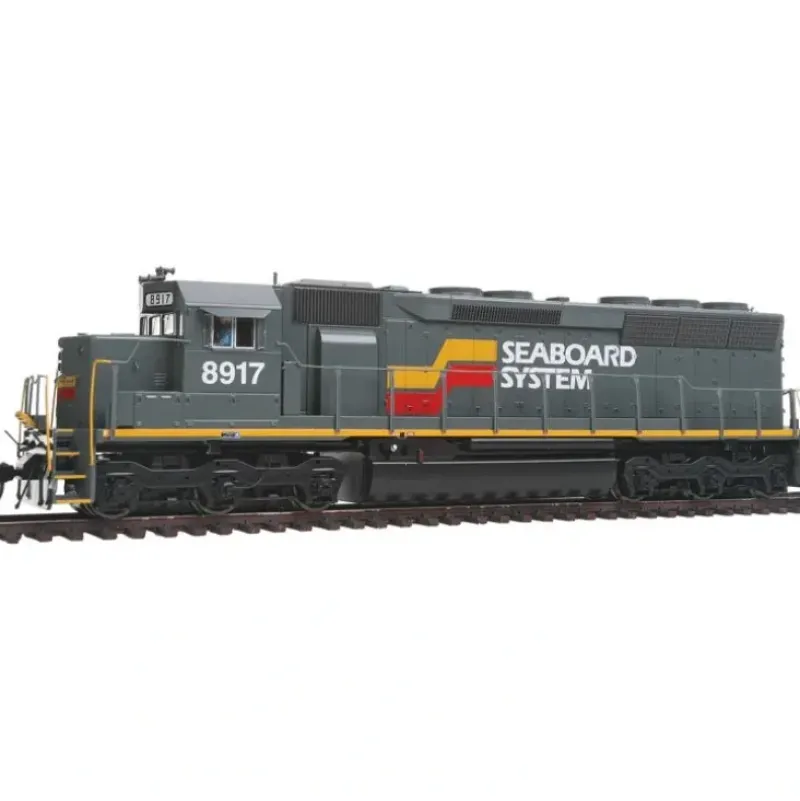 This is a Walthers 920-41065 HO scale EMD SD45 – Tsunami(R) Sound & DCC Seaboard System #8917 (gray, yellow, red, white) * Limited Edition – One Time Run of These Roadnumbers! * Roadname-Specific Detailing * 14:1 Helical Gears for Smooth, Quiet Performance * 5-Pole Skew-Wound High-Torque High-Efficiency Can Motor * Machined-Brass Flywheels * Low Speed Under 3 Scale MPH * Now with Soundtraxx Tsunami Sound for DCC or DC Layouts * Standard DC Versions also Available * LED Constant & Directional Headlights * Proto MAX(TM) Metal Knuckle Couplers By 1964, six-axle diesels were rapidly evolving from low speed luggers to fast freight engines. EMD continuously updated its Special Duty (SD) series with new models, and celebrated New Years Day 1966 by unveiling six locos powered by variations of its new 645 prime mover. At the top was the SD45, with an enormous 20-cylinder power plant cranking out 3600 horsepower. Timing couldn’t have been better as American railroads experienced a surge in traffic and were ready to modernize their fleets. The SD45 proved popular for all types of assignments, and 1,260 were built through late 1971, when it was replaced by the SD45-2. Retirements began in earnest in the 1980s, but many were rebuilt and eventually sold to regional railroads. As of 2011, a few are still in use, and several are preserved in museums. Detailed to match units in service from 1985 to 1987 with: * Plated Over Cab-Mounted Headlights * Nose-Mounted Headlights * Long Blower Sill Duct * No Footboards on Pilots * Modern Style Coupler Cut Lever * 5-Chime Horn * Firecracker Antenna * No External Hand Brake * Air Filter Box * Late Flexicoil Trucks with Two Low, Inside Mounted Brake Cylinders