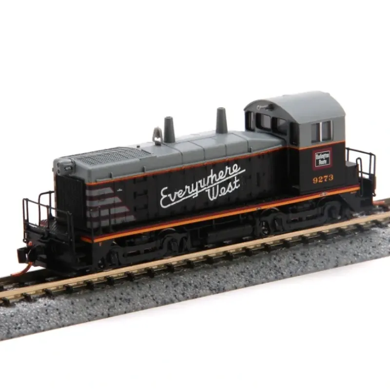 This is a Walthers 920-80152 N scale EMD SW9/1200 – Standard DC – PROTO N(TM) Chicago, Burlington & Quincy #9273 (black, gray, Everywhere West Slogan) * Limited Edition — One Time Run of These Roadnumbers! * Perfect for Yard or Industrial Work * Split Frame Mechanism * All-Wheel Drive & Electrical Pickup * 5-Pole Skew-Wound Motor * Die Cast Underframe for Pulling Power * RP-25 Metal Wheels Operate on Code 55 or Larger Rail * Micro-Trains(R) Couplers By 1954 railroads were buying diesels as fast as EMD could build them, and customer demand for more powerful units carried over into the switcher market as well. With the introduction of the new 567C prime mover that year, EMD rolled out its new 1200-horsepower SW9/1200 model which shared the same basic body (with minor variations) and power rating with its predecessor, the SW9 (which had a 567B prime mover). SW9/1200s were produced through 1966 when earlier GPs began taking over yard chores, but these later SW models lead long lives with many still serving shortline and industrial roads long after retirement by the original owners. CN #7022 CN #7025 CB&Q #9273 CB&Q #9277 CNW(TM) #1207 CNW(TM) #1209 NYC #8964 NYC #8974