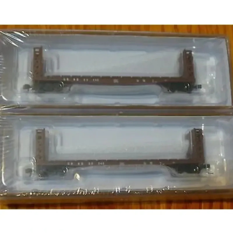 This is Walthers 28223 GSC Flatcar-CBQ. Walthers Rolling Stock 54′ GSC commonwealth bulkhead flatcar 2-pack, ready to run. Chicago, Burlington & Quincy #95245 & 95240 (boxcar red). One of the most common of all flatcars, GSC Commonwealth 54′ Flatcars have been in service since the 50s. Built around a large one-piece steel casting, the prototypes could handle a wide range of cargo and were often rebuilt for piggyback loading. In later years, they were fitted with bulkheads and handled loads such as lumber and pipe, and some lines added portable bunks for handling logs.