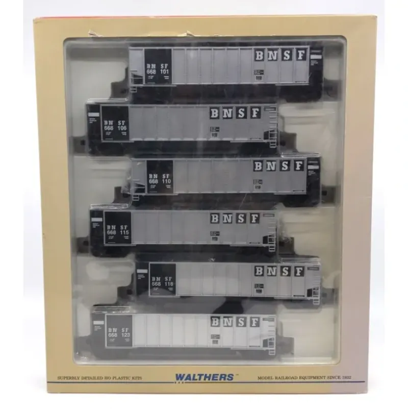 Here is a Walthers 932-5327 HO Scale Burlington Northern Santa Fe Bethgons (Pack of 6). These cars feature plastic body construction, plastic trucks, and plastic wheels with metal axles. These cars feature dummy knuckle couplers with operating couplers at each end of the consist.