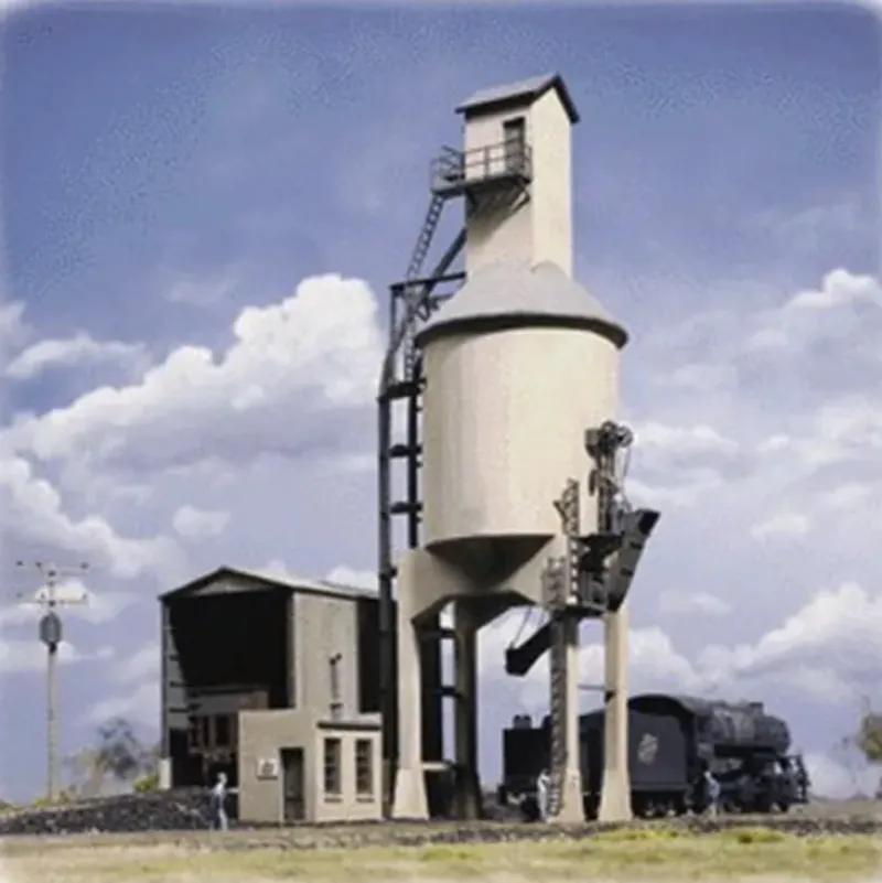 When steam ruled the rails, the prototypes for the Walthers Cornerstone Concrete Coaling Tower were familiar sights at every engine terminal. Some also stood alone on main lines, ready to service passing trains that might require refueling along the way. While early designs were made of wood, later models were made of fire-proof concrete. Hoppers of coal would be spotted for unloading above a covered dump pit. Lifting machinery hauled he coal to the top, where it was stored in the bin. Gravity and positionable chutes took over, delivering a steady stream of coal into waiting tenders below. Many of these durable structures outlived their usefulness, but proved too expensive or difficult to tear down. A few still stand, stripped of their steel hardware, a monument to days gone by. Whether alive with action or quiet and abandoned, this model can be the focal point of your engine service facilities or a great scene along your mainline. It’s complete with covered unloading pit, machinery house, lifting equipment and positionable chutes to serve two tracks. As the prototypes go, this model represents a medium sized tower, making it ideal for layouts large or small. The plastic parts feature realistic concrete and steel detailing and are molded in realistic colors. A complete set of instructions and decal signs are included. The finished Concrete Coaling Tower measures: 4-1/8 x 6-3/8 x 11 10.3 x 15.9 x 27.5cm with tower and shed.