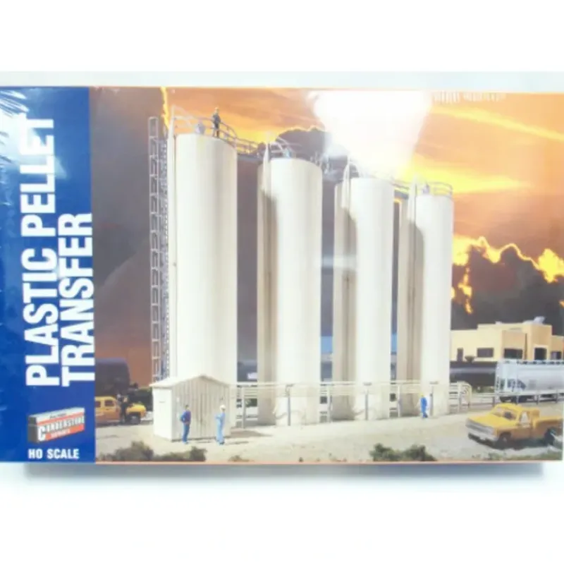Modeling a modern Plastic Pellet Transfer is easy with this Walthers Cornerstone kit! Derived from crude oil, plastics are first formed into tiny pellets which become the raw materials for everything from soda bottles to model railroad equipment. Lightweight and easily handled by pneumatic systems, the pellets are shipped in bulk in covered hoppers and stored on-site in vertical storage tanks. Large air compressors power these facilities, which feature a number of delivery pipes and control valves. When assembled, the Plastic Pellet Transfer is great by itself at trackside as a truck reload point for local deliveries. It’s easily combined with other big industrial buildings, especially those in modern industrial parks, to create a custom plastics plant anywhere along your line. You can also use it model other types of pneumatic storage and delivery systems like those found at commercial bakeries, flour mills, chemical or fertilizer plants and many, many other industries found at modern industrial parks. The Plastic Pellet Transfer kit includes four storage silos, unloading piping for two hopper cars, walkways and railings, a compressor shed, piping and decal signs. Plus, molded-in cut lines are provided to make kitbashing fast and easy. Dimensions: Kit – 19-5/8 x 4-1/16 x 8-1/4 49.8 x 10.3 x 21cm
