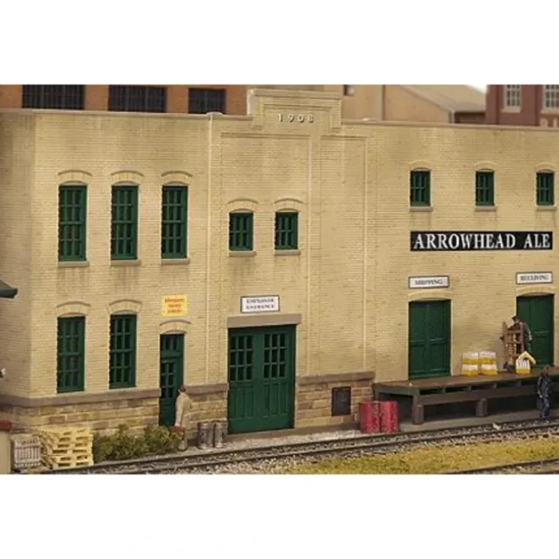 12-1/4 x 4-5/8 x 2-1/8 31.1 x 11.7 x 5.4cm The Arrowhead Ale Background Building is the track side wall of a brewery building. Featuring a box car loading dock and wall details that suggest that the structure was expanded in sections, it’s typical of brick trackside industrial buildings across the continent. It’s ideal for any kind of industry and include realistic decals for several businesses.