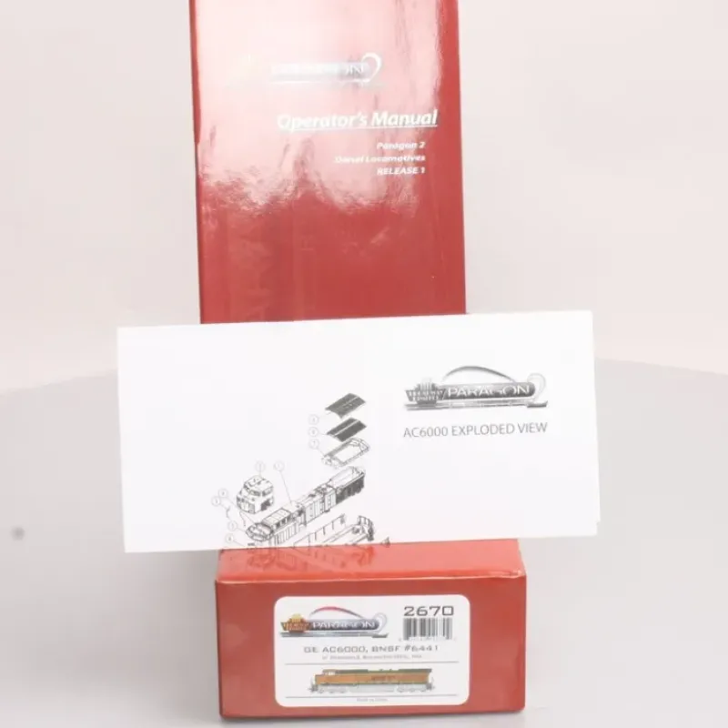 This is a Broadway Limited 2670 HO Scale BNSF Railway GE AC6000CW with Sound & DCC – Paragon2 #6441 (orange, black, Wedge Logo). Features: Precision gearing, 5-pole skew-wound can motor, dual flywheels, ABS plastic body with heavy die cast chassis and separately applied details.