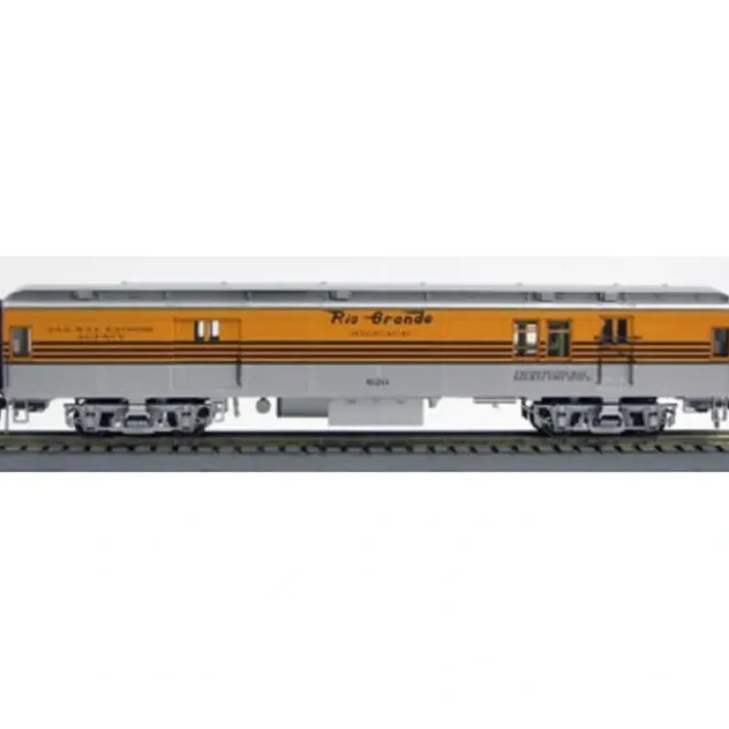This is Con-Cor 94317 65′ Bagg/Mail DRGW. Heavyweight 65′ Branchline baggage/railway post office with lights, Denver & Rio Grande Western (4-stripe scheme, Aspen Gold, silver), ready to run.